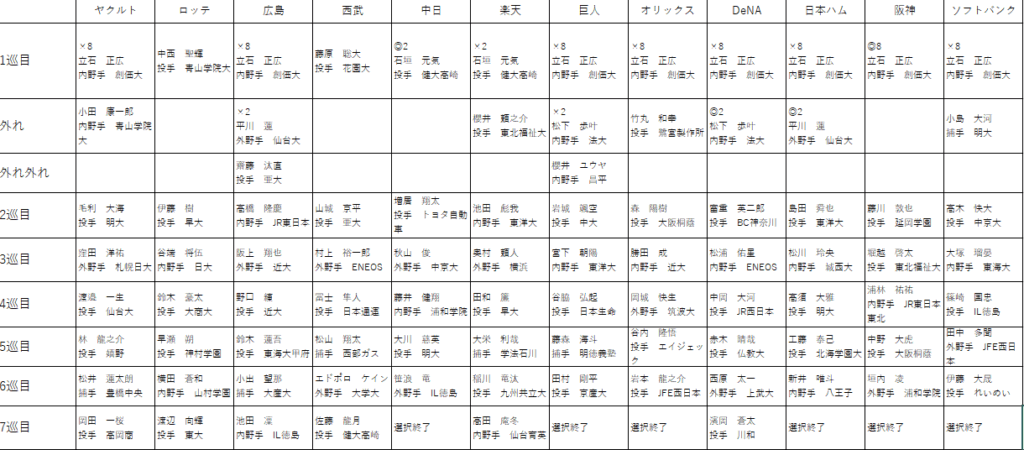 またやはりソフトバンクや阪神といった近年安定して力を発揮しているチームの方が楽な気持ちで選手を指名できるように感じた。チーム状況が安定しているということは大きな強みである。